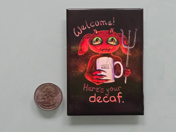 Nothing says “eternal suffering” like a lukewarm cup of decaf. This cute devil knows the drill—smiling sweetly while serving damnation one chipped mug at a time. A darkly funny greeting card for caffeine addicts, pessimists, and anyone who’s ever been personally victimized by weak coffee.