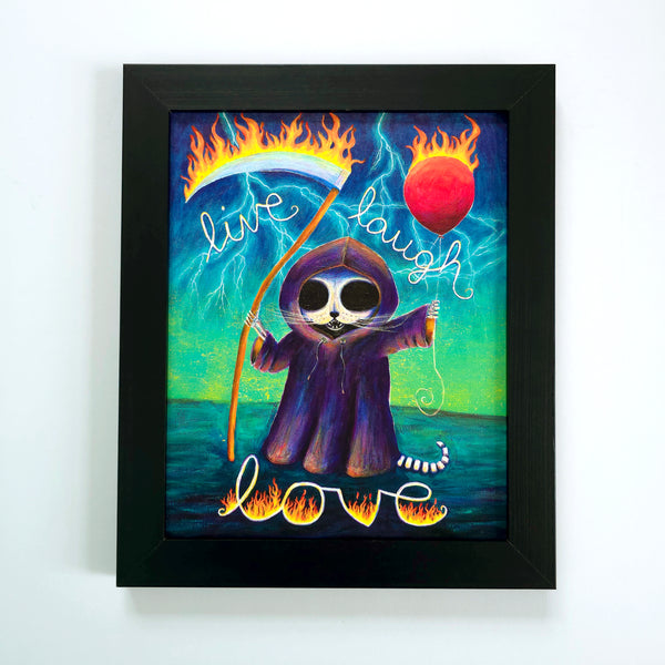 Finally, a version of Live Laugh Love that tells the truth. Our skeleton Grim Reaper cat beams with infernal joy, clutching a flaming balloon and scythe as lightning crackles behind. A darkly funny cat card for anyone whose aesthetic leans more “goth Airbnb” than farmhouse chic. Cute, creepy, and perfectly unhinged.
